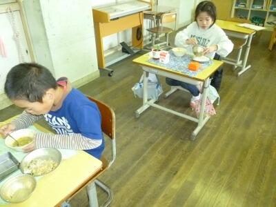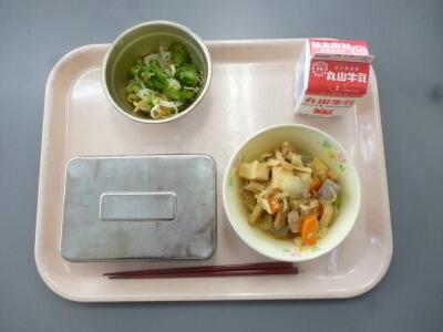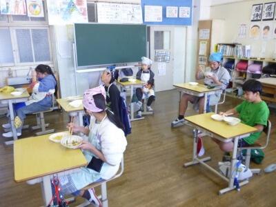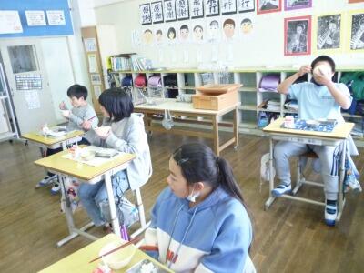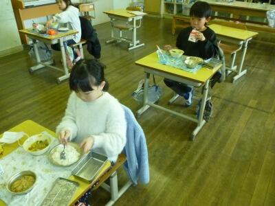 毎月1回、東小学校の栄養教諭が方財小学校の給食の様子を見に来てくださいます。2月15日は、5・6年生教室で一緒に給食を食べてくださいました。この日のメニューは、大きいおかずが「干し大根のうま煮」で、小さいおかずが「いかとキュウリの酢の物」でした。おいしくいただきました。