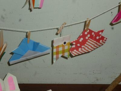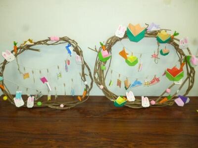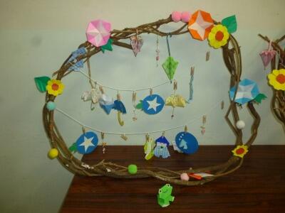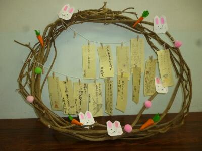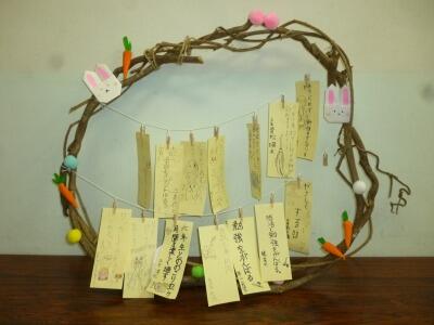 先週、地域の方が手作りのリースを持ってきてくださいました。リースには糸が通してあり、糸にはクリップが付いています。早速、子ども達が自分の願いや目標を短冊に書いて、クリップに付けました。「二重跳びで100回跳ぶ」「魚釣りで大物が釣れますように」など、見ているだけで楽しくなります。