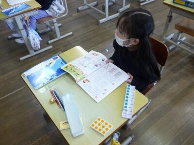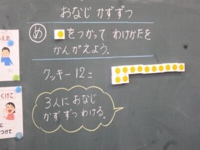 1年生の算数の授業の様子です。数図ブロックを使って、同じ数ずつ分ける勉強をしていました。