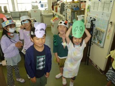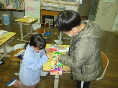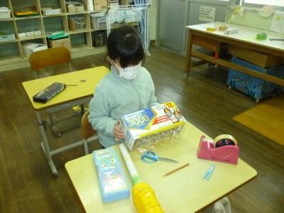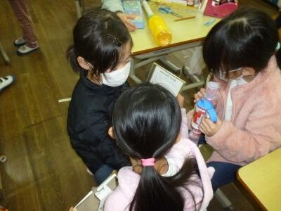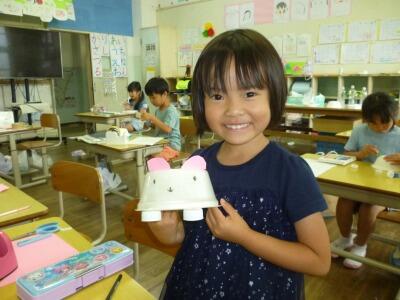 1・2年生の生活科の学習の様子です。「世界で一つの私のおもちゃ」というテーマで、おもちゃづくりをしました。図工の学習との違いは、ねらいが、「遊びの工夫」にあることです。おもちゃを使って友達と遊ぶことを通して、約束やルールが大切なことや友達のよさに気付いていきます。