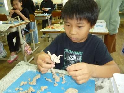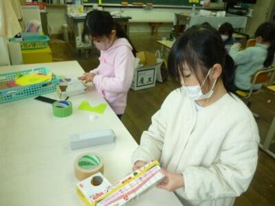 1・2年生の図工の授業の様子です。「音づくりフレンズ」という学習で、空き箱や空き缶などのいろいろな材料を使って、太鼓やギターなどの楽器を作る活動です。子ども達のアイデアは、素晴らしいですね!