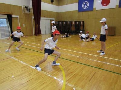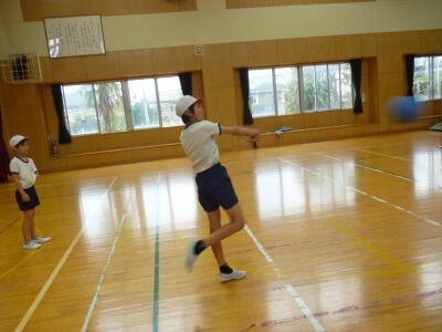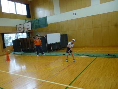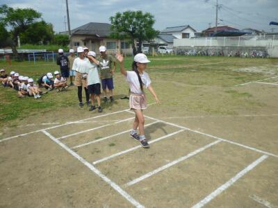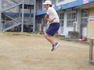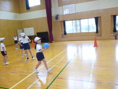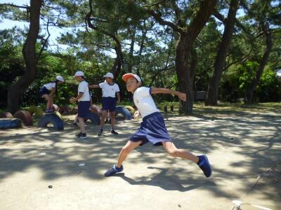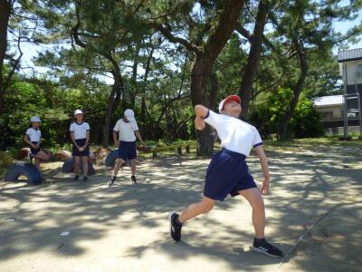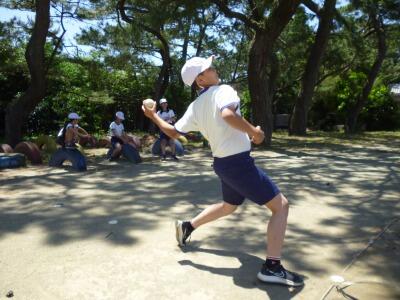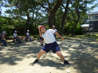 5・6年生の体育の授業の様子です。6月2日に行う「体力テスト」の練習をしていました。写真は、ソフトボール投げの様子です。伝統のソフトボールチームに所属している子どもは、さすがに遠くまで投げていました。