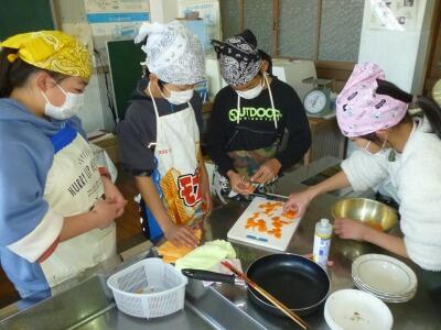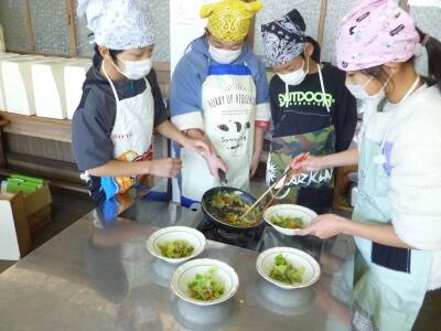 2月28日に、5・6年生が調理実習を行いました。メニューは、三色野菜(キャベツ、ニンジン、ピーマン)の油炒めと、スクランブルエッグです。