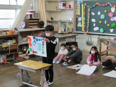1・2年生の図工の授業の様子です。「カラフルなもよう」という学習で、四角や三角、丸の図形を組み合わせた絵に、クレヨンでカラフルに色を塗っていきます。鮮やかな色合いの作品ができあがっていました。