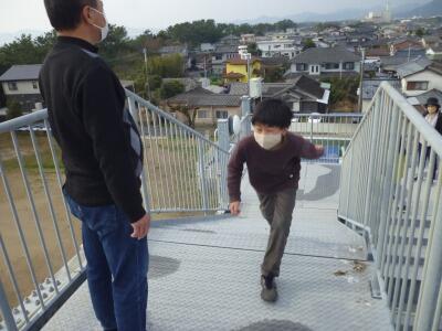 本やインターネットを活用して調べることもできますが、今回のような体験活動はとても大事です。目をつぶって杖を使う体験もさせていただきました。