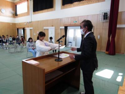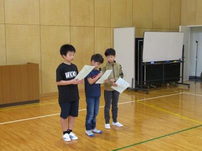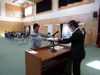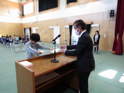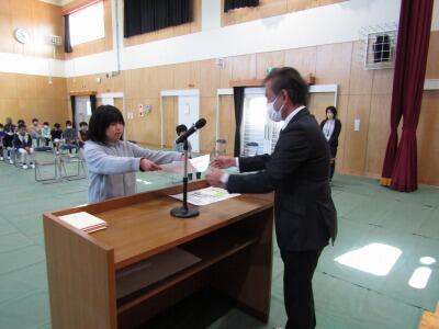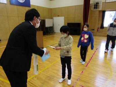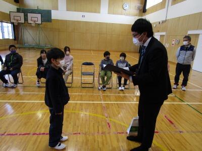 3月24日に、修了式を行いました。各学年の代表の子どもに、修了証書を授与した後、1年生と5年生の子どもが「3学期に頑張ったこと」を発表しました。