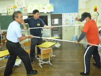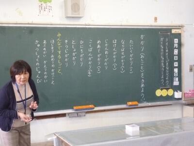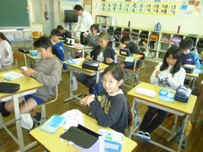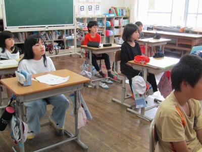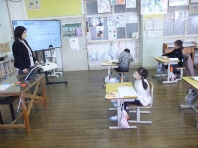 方財小学校では、毎月15日を「姿勢の日」として設定し、指導を行っています。養護教諭が、「姿勢棒?」を持って各教室を回り、声かけをしている場面です。