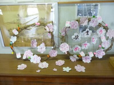 地域の方(いきいきはまゆうサロンさん)が、新しい掲示物を持ってきてくださいました。今回は、「卒業おめでとう」バージョンです。桜の花もきれいに飾っていただいています。