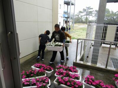 2月18日と19日に、大瀬川河川敷で、延岡花物語が開催されました。催し物の一つで、イオンさんによる「ビオラ7000本の巨大花文字アート」があったのですが、使用後のビオラを学校に寄贈したいというお話がありました。そこで、申し込んだところ、3ケースをいただきました。