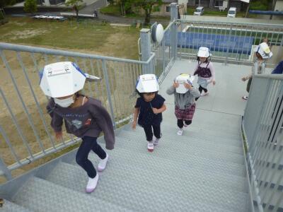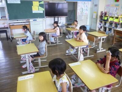 6月8日に、避難訓練(不審者)を行いました。不審者が運動場から1・2年教室に侵入したという想定です。子ども達を2階のひまわり教室(一番奥の教室)に避難させ、複数の職員で不審者に対応しました。