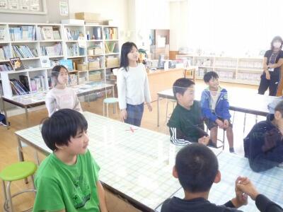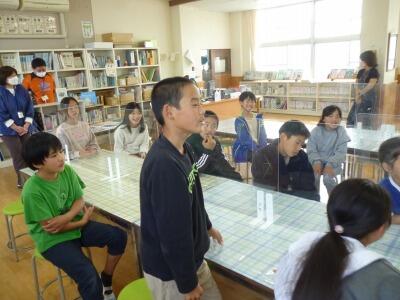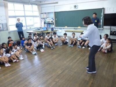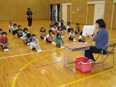 その後、方財小の運動場に集合し、保護者(看護師さん)による説明「骨折した方への対処法」や、消防団による放水訓練の見学、そして、図書室で「萌ぎの会」による読み聞かせ「琴姫の松 など」を聞きました。