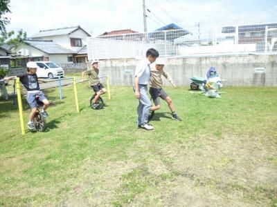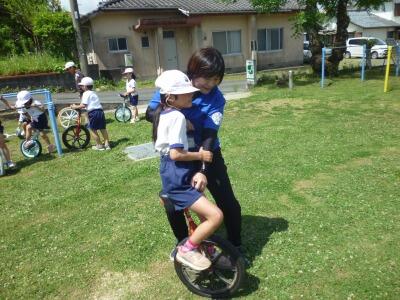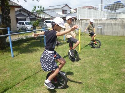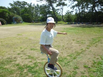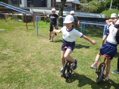 方財小学校では、業間の時間に「チャレンジタイム」があります。5月23日は、一輪車に挑戦しました。一人一人の子どもに専用の一輪車がありますので、昼休み時間に一生懸命練習する姿も見られます。