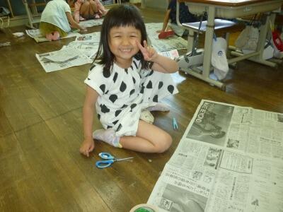 1・2年生の図工の授業の様子です。「新聞紙と仲よし」という学習で、新聞紙を丸めたり、破ったり、折ったり、切ったり、つなげたりして作品にしていきます。写真は、みんなで家を作っている場面です。楽しく活動していました。