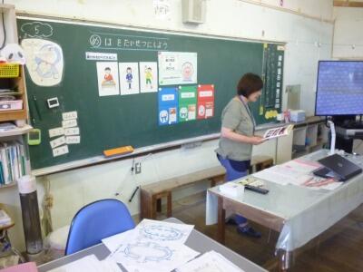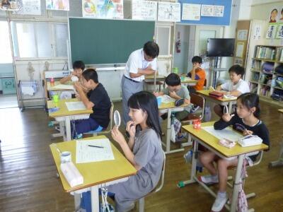 具体的には、よく噛むとなぜよいかについて、「ひみこのはがいーぜ」のキャッチフレーズをもとに指導しました。また、授業の最後には、歯ブラシと手鏡を使って、実際に歯磨きの練習をしました。