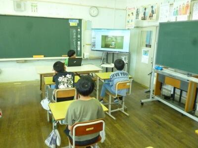 3・4年生の総合的な学習の時間の様子です。「盲導犬や点字ブロックについて知ろう」という学習で、動画を通して学んでいる場面です。