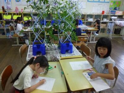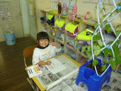 1・2年生の生活科の授業の様子です。この日は雨でしたので、教室の中でアサガオとミニトマトの観察を行いました。ずいぶん大きく成長しています。