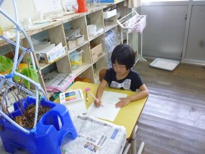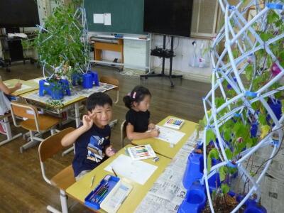 1・2年生の生活科の授業の様子です。1年生は、アサガオの観察をしていました。花も咲き始めました。2年生は、ミニトマトの観察です。実が赤くなり始めました。