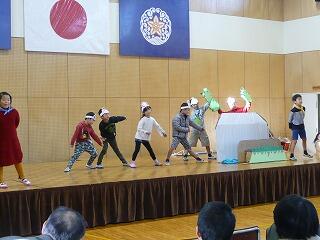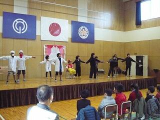 今日の業間は「子ども集会」でした。「子ども集会」は、各学年で学習したことを発表します。今日は、1・2年生の発表でした。
