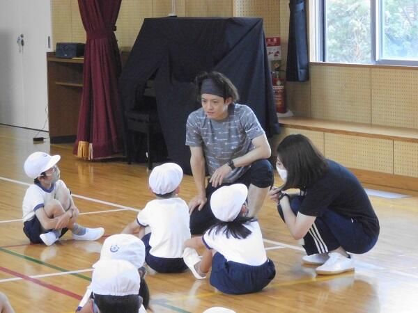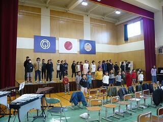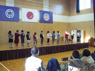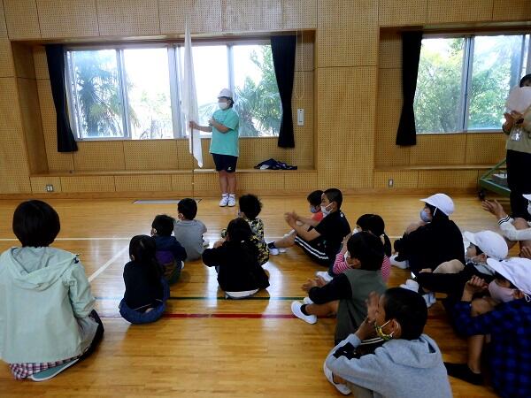 全員が体育館に集合し、はじめに「かえるの合唱」「虫のこえ」「山の音楽家」「森のくまさん」「もみじ」を輪唱したり、合唱したりしました。