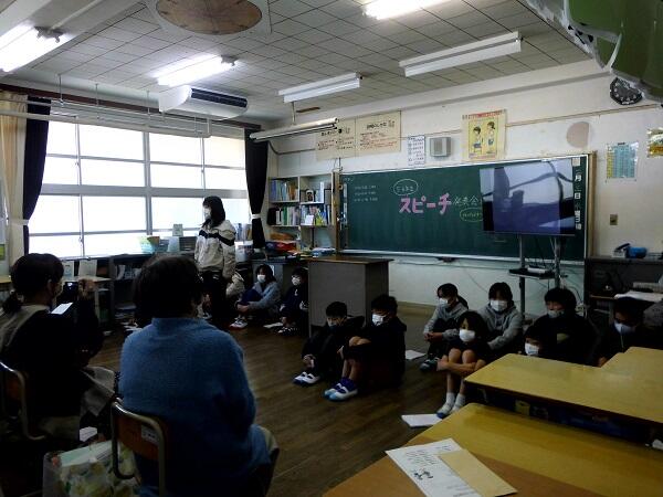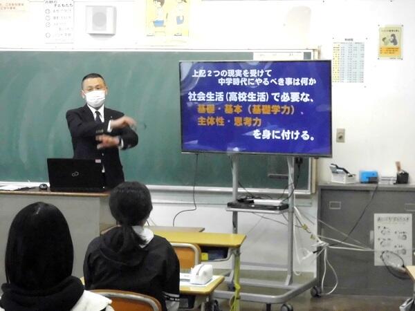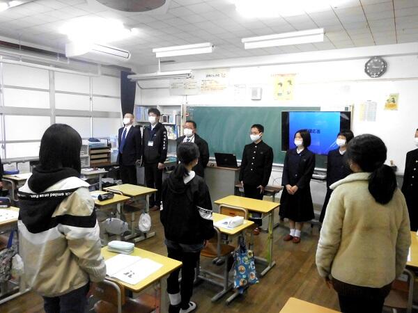 昨日、延岡中学校の土井校長先生をはじめ、2人の先生と4人の生徒会役員の方々が方財小に来られ、6年生に向けて「入学説明会」を行ってくださいました。本来なら、保護者の皆さんと一緒に行って聞かせていただく予定だったお話を、わざわざ小学校に来て聞かせてくださいました。