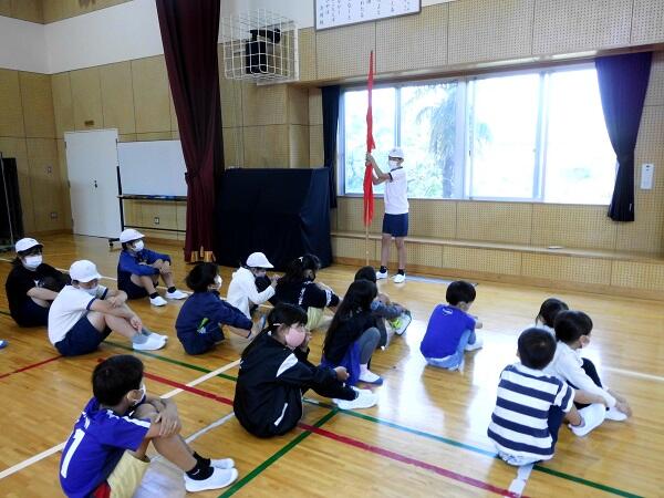 先週までで水泳の学習が終わり、今日から10月27日の運動会に向けた練習が開始されました。今日の業間は、その運動会の結団式でした。2人の団長の紹介の後、ペットボトルを振って、赤団・白団を決めました。校長先生から団長にそれぞれの団旗が渡され、いよいよ赤団対白団の戦いが始まりました。今日は、緊張していた団長やリーダーでしたが、明日からは次第に気合いが高まってくることでしょう。