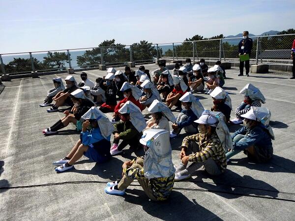 地震発生直後に1次避難をしたあと、タタメットで頭を守りながら2次避難として屋上に行きました。無言で行動でき、避難経路も確認できました。