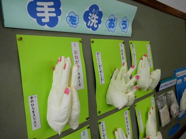 コロナ対策の一つとして、手洗いの徹底を継続して指導しています。更なる徹底のために、養護教諭の髙群先生が、見て分かりやすいように立体的な掲示物を作成しました。子ども達も改めて手洗いの手順を確認していました。