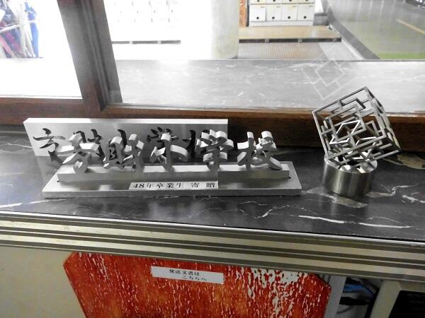 昨日、方財小を昭和48年度に卒業したとおっしゃる方が学校に来てくださり、「還暦を迎える記念に」ということで、写真のような金属加工した学校名のプレートを届けてくださいました。