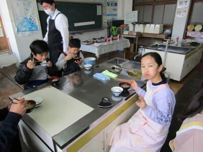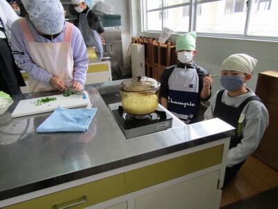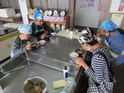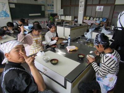 5・6年生の家庭科の授業の様子です。1月19日に、調理実習を行いました。作ったのは、ご飯と大根の味噌汁です。お米は、鍋で炊きました。味噌汁は、いりこで出汁を取りました。やっぱり、自分達で作ると、味は最高ですよね。休みの日に、家でも味噌汁を作ってほしいと思います。
