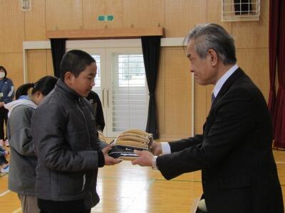 その後、大谷選手からプレゼントされたグローブの贈呈式を行いました。また、ソフトボールクラブに所属している子どもたちが、キャッチボールのデモンストレーションをしました。