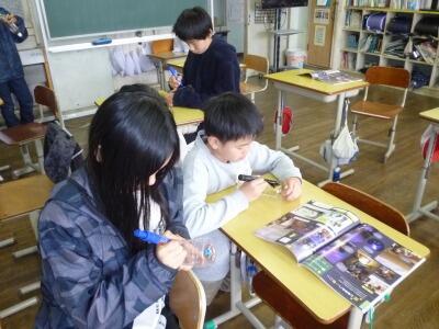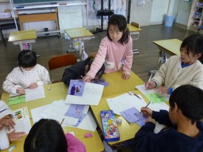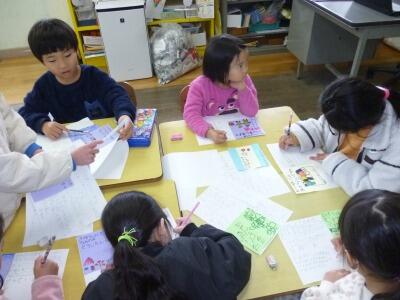 1・2年生の生活科の授業の様子です。ほうざい保育園の年長さんから、小学校生活に関する質問のお手紙が届きました。その返事を考えて書いている場面です。保育園との連携を今まで以上に深めていきたいと考えています。