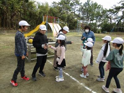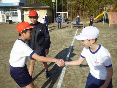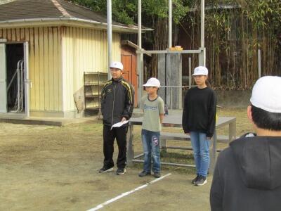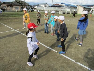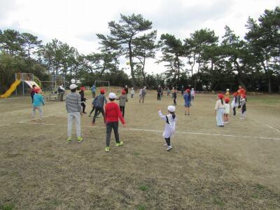 お別れ集会は、運動場で行いました。方財小の運動場は、水はけがとてもよいので、ありがたいです。全校の子ども達で、陣取り、ドッジボール、6年生とのじゃんけん大会をして楽しく過ごしました。子ども達にとって大切な思い出の一つになったと思います。