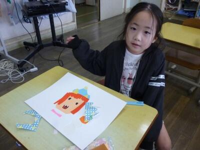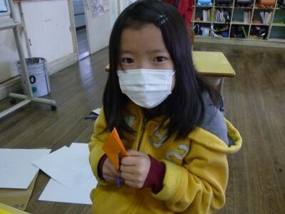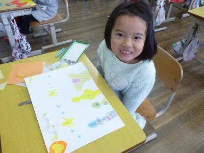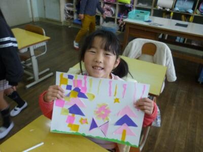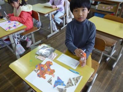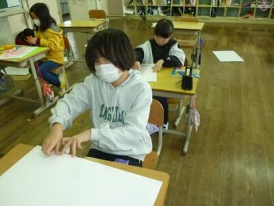 1・2年生の図工の授業の様子です。折り紙を使って、様々な模様をつくっていました。
