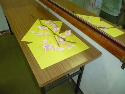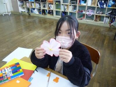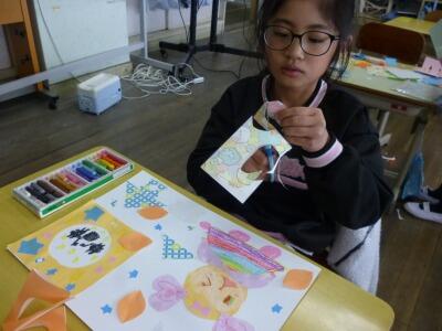 3・4年生の図工の授業の様子です。「開いて広がる不思議な世界」という学習で、紙を折り曲げ、はさみで切って広げます。お花などを楽しそうに作っていました。