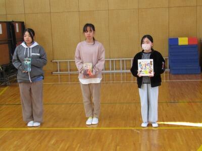 修了式後は、生徒指導担当職員の話「春休みのくらしについて」、多読賞の表彰を行いました。5年生の子どもは、3学期中に本を79冊借りて読みました。すごいですね。