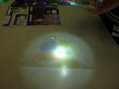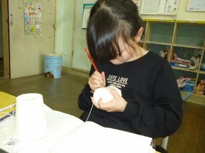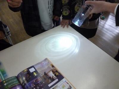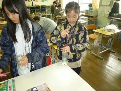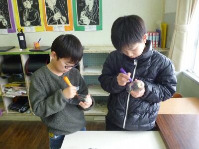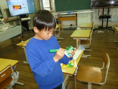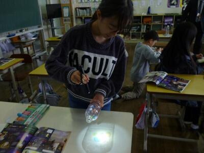 5・6年生の図工の授業の様子です。「光と場所のハーモニー」という学習で、ペットボトルにマジックで模様をつけ、ライトで照らすときれいな模様が映し出されます。写真では、作成途中でしたので、明るい教室でライトで照らしていますが、暗幕を閉めた真っ暗な教室で試すと、さらにきれいな模様になりそうです。