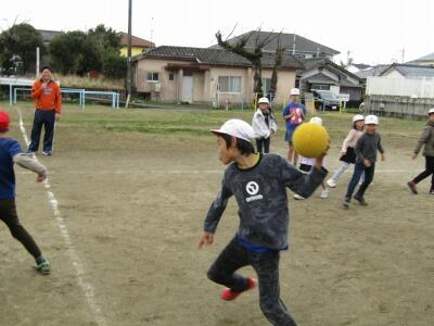 昼休み時間の様子です。この日は風が強くとても寒い日だったのですが、たくさんの子ども達が運動場で遊んでいました。