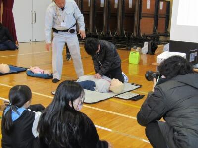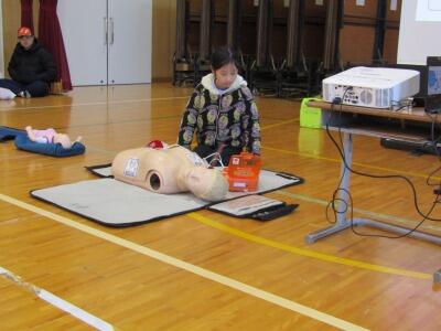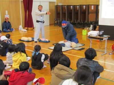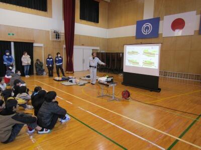 その後、方財小の体育館に集合し、市消防本部警防課推進員(方財区在住)による講話と心肺蘇生法講習会を行いました。