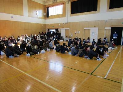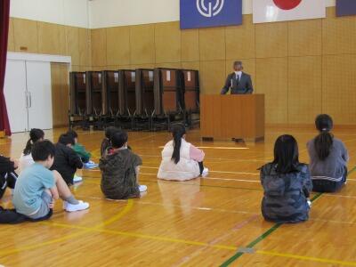 2月27日に、3月分の全校集会を実施しました。3月の目標である「1年間の自分の(学習・生活・健康)を振り返ろう」に関連した指導を行いました。