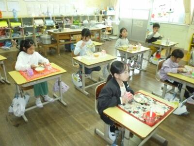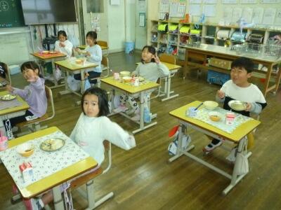 1・2年生の給食の様子を紹介します。この日は、全員が、自分の量の給食を完食することができました。2日連続です。今年度23回目だそうです。子ども達も大喜びでした。