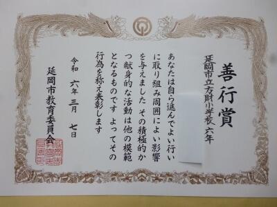 6年生の子どもに、延岡市教育委員会から、善行賞の賞状が届きました。朝の時間を活用して、全校児童の前で表彰を行いました。