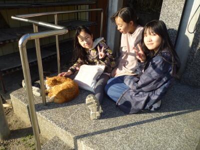 3月8日の放課後の様子です。女の子達が元気に走り回っていたり、猫に癒やされていたりしていました。