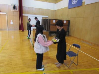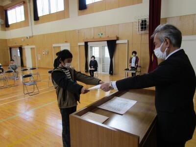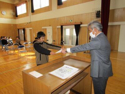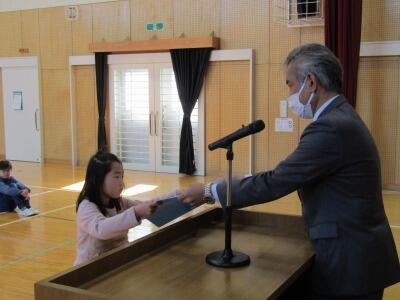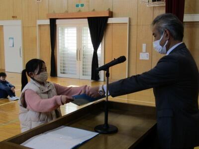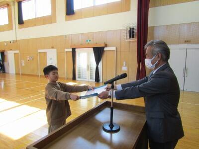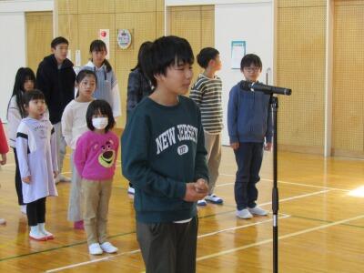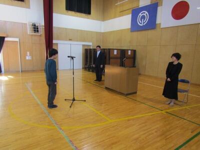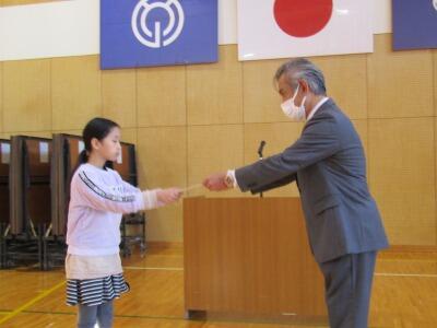 3月26日に、修了式を行いました。各学年の代表の子どもに、修了証書を授与した後、5年生の子どもが「3学期に頑張ったこと」を発表しました。