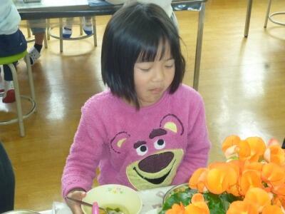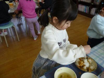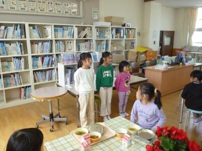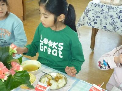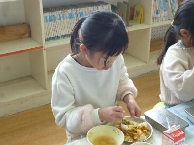 3月14日に、1・2年生の子ども達とほうざい保育園の年長さんとの交流給食を行いました。数年ぶりの開催です。この日のメニューは、ドライカレー、ベーコンと白菜のスープでした。いろいろとお世話をする1・2年生の子ども達が、お兄さん・お姉さんみたいに、とても頼もしく見えました。