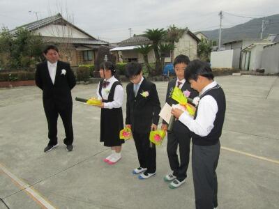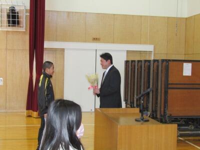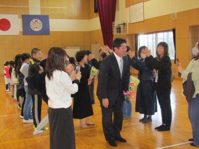 離任式では、転任者あいさつ、児童代表の言葉、花束贈呈、校歌斉唱の後、アーチを作って転任者を送り出しました。4月から、また新しい職場で益々のご活躍をお祈り申し上げます。