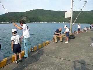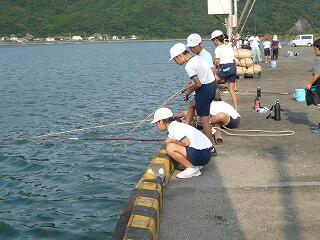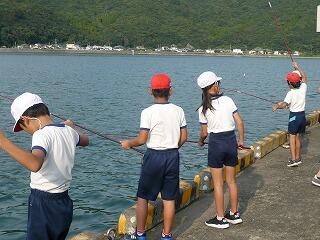 学校から歩いて5分の漁協前で釣り糸を垂らしました。釣りが初めてで、思うようにいかない子もいましたが、漁協職員の方々がお手伝いしてくださり、何とか楽しむことができました。