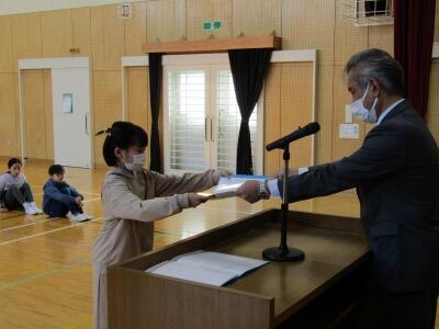 3月26日に、修了式を行いました。各学年の代表の子どもに、修了証書を授与した後、5年生の子どもが「3学期に頑張ったこと」を発表しました。