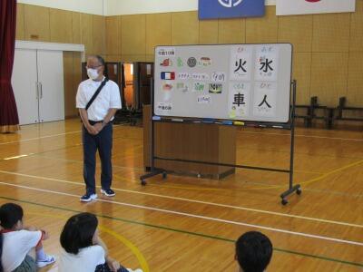 7月31日に、1学期の終業式を行いました。意見発表では、2年生と6年生の子どもが1学期に頑張ったことを発表しました。2年生の子どもは、算数、水泳、書写を頑張りました。6年生の子どもは、保健給食委員会の活動、漢字を頑張りました。また、1学期にたくさん本を読んだ子どもの表彰も行いました。127冊の本を借りて読んだ6年生の子どもに、代表として、「多読賞」を授与しました。