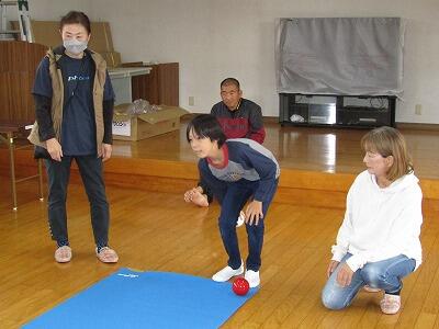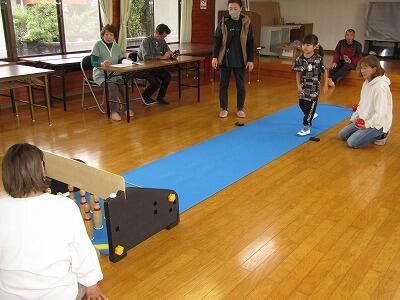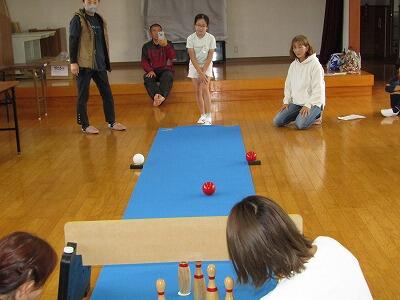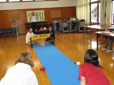今回は、「ミニボウリング」について紹介します。会場は、学校から歩いてすぐの所にある方財公民館です。「ミニボウリング」は、木製のピンを使っていますので、距離は短いですが、かなり本格的です。ピンが倒れる音は、本物のボウリングと変わりません。