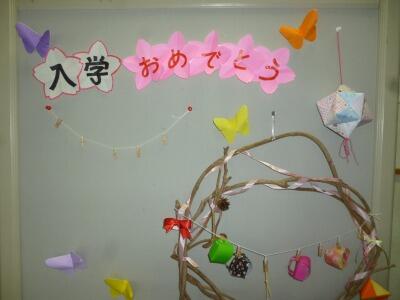 地域の方(いきいきはまゆうサロンさん)が、新しい掲示物を持ってきてくださいました。今回は、「入学おめでとう」バージョンです。ミニランドセルなどをきれいに飾っていただいています。